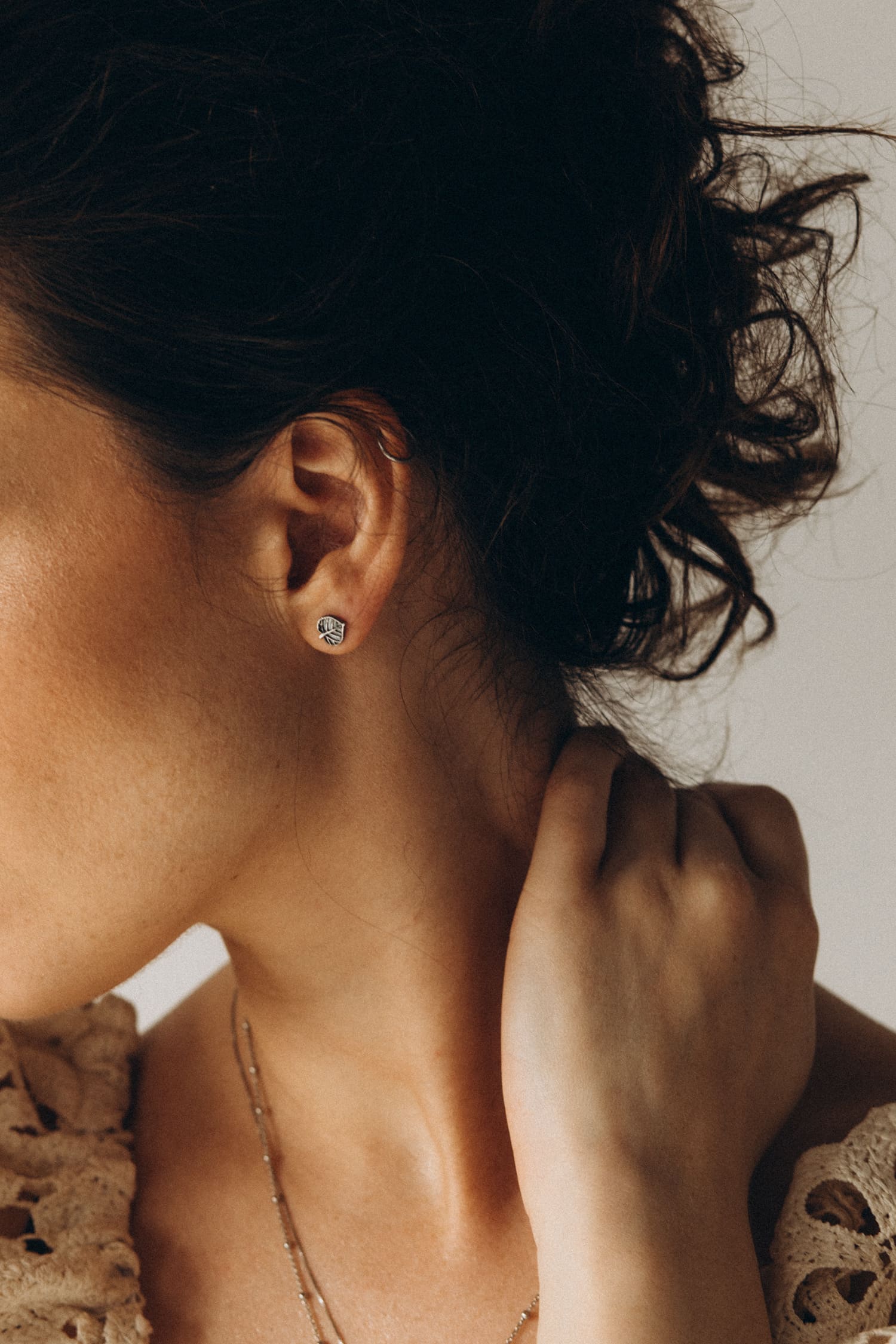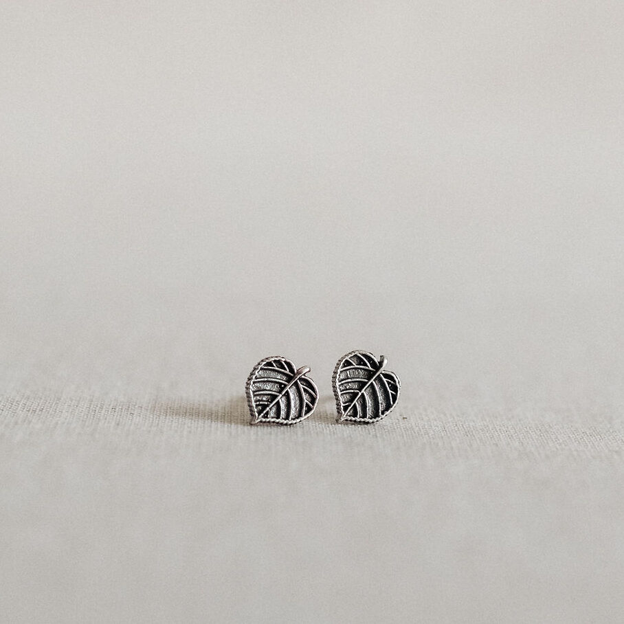Kleine, leichte Blatt-Ohrringe, die in unserer Werkstatt entworfen wurden. Sie werden mit Steckern ins Ohr gesteckt.