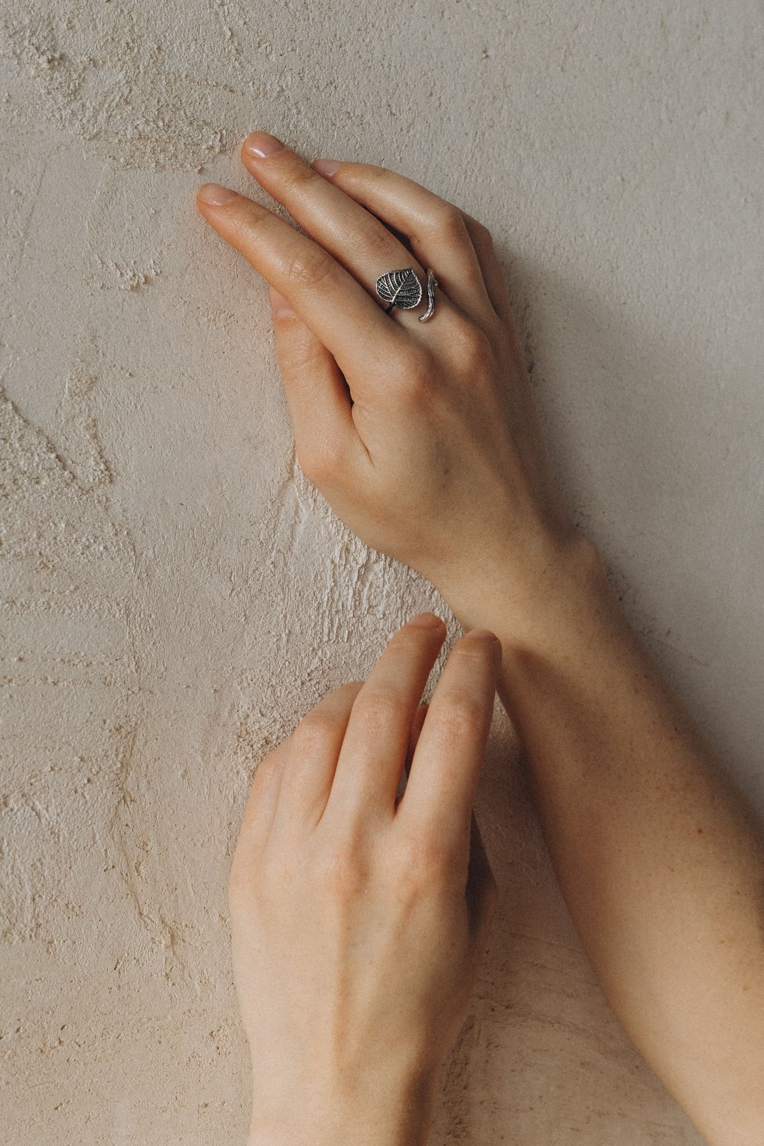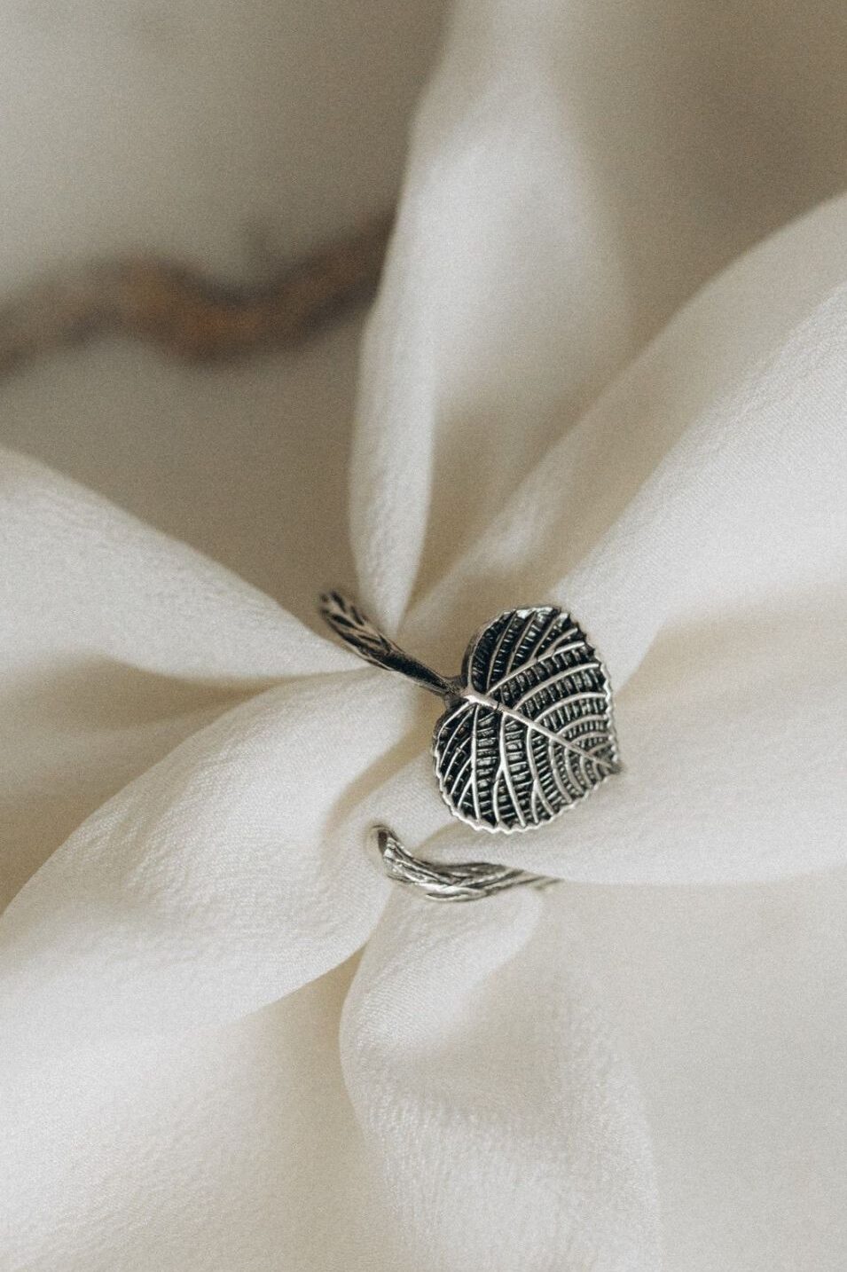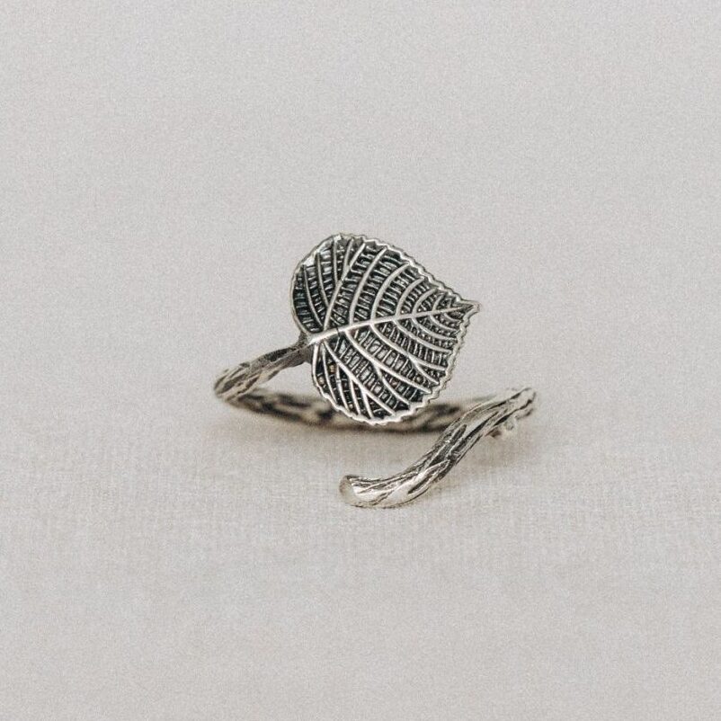 Ring aus 925er Silber mit Lindenblatt, das den Finger umhüllt. Ideal für Naturliebhaber.