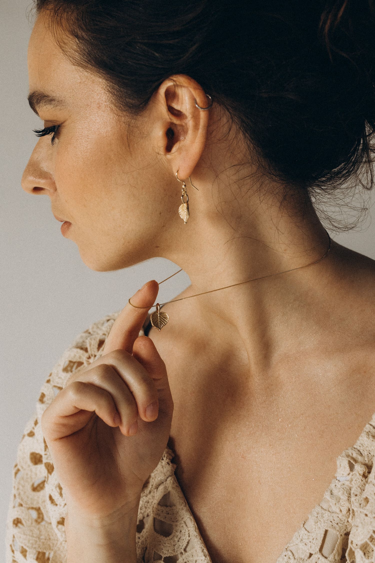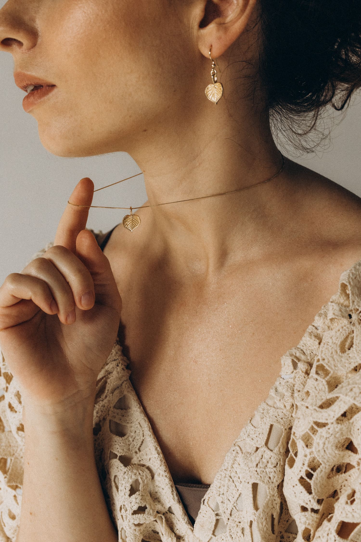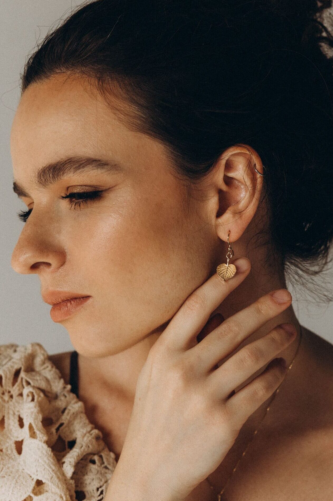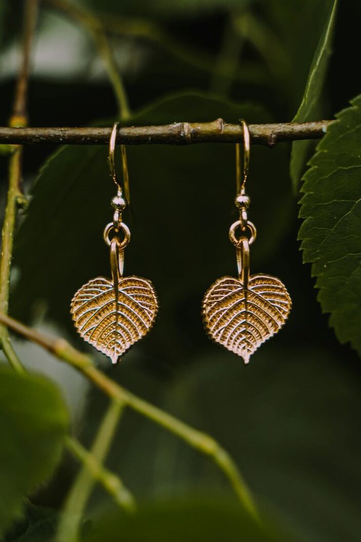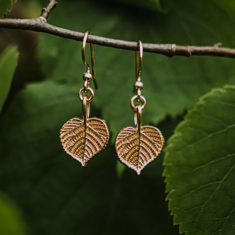 Zarte Ohrringe mit Lindenblättern aus vergoldetem Silber. Sie erinnern uns daran, dass Liebe und Sensibilität eine starke Kraft sind.