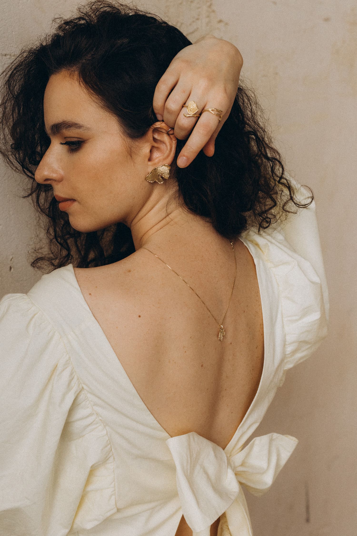 Zarte Statement-Ohrringe aus 925er Sterlingsilber, vergoldet mit 18 Karat Gold. Für Liebhaberinnen botanischer Akzente.