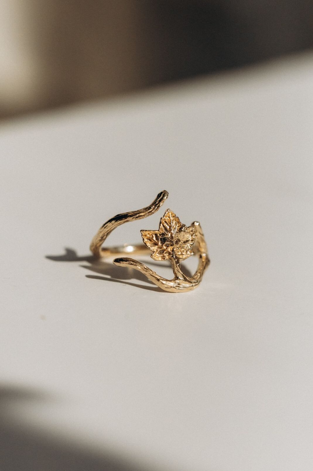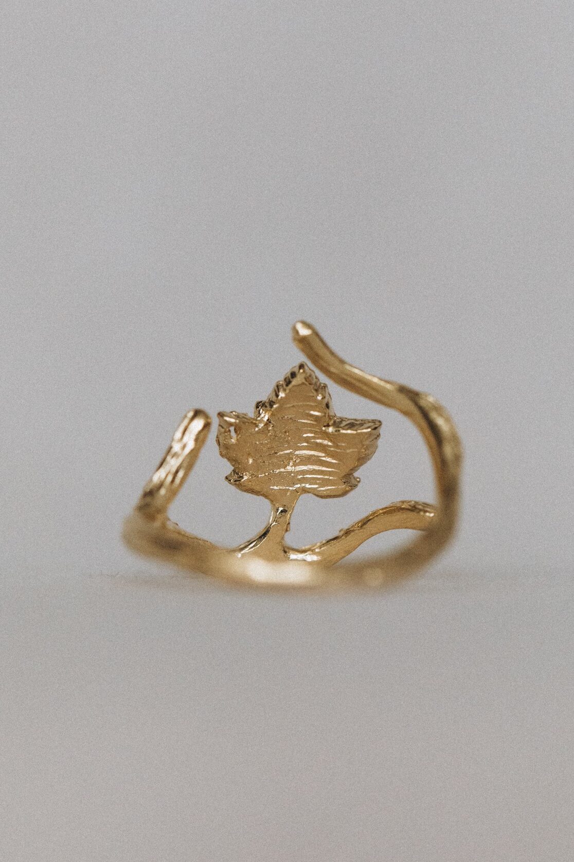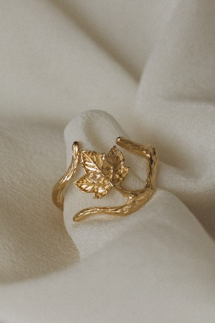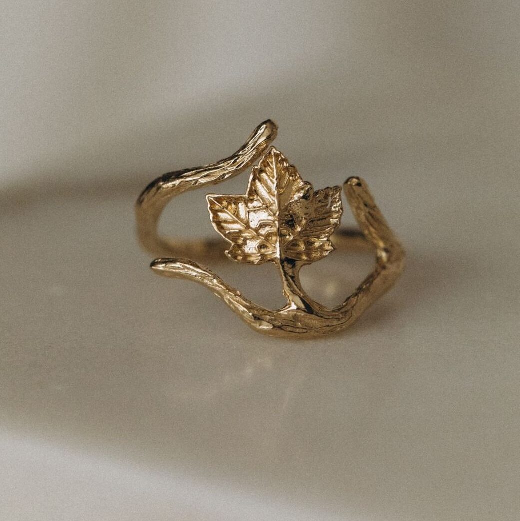 Einzigartiger Ring mit einem Bergahornzweig, aus 925er Silber, vergoldet mit 18-karätigem Gold. Ideal für Naturliebhaberinnen.