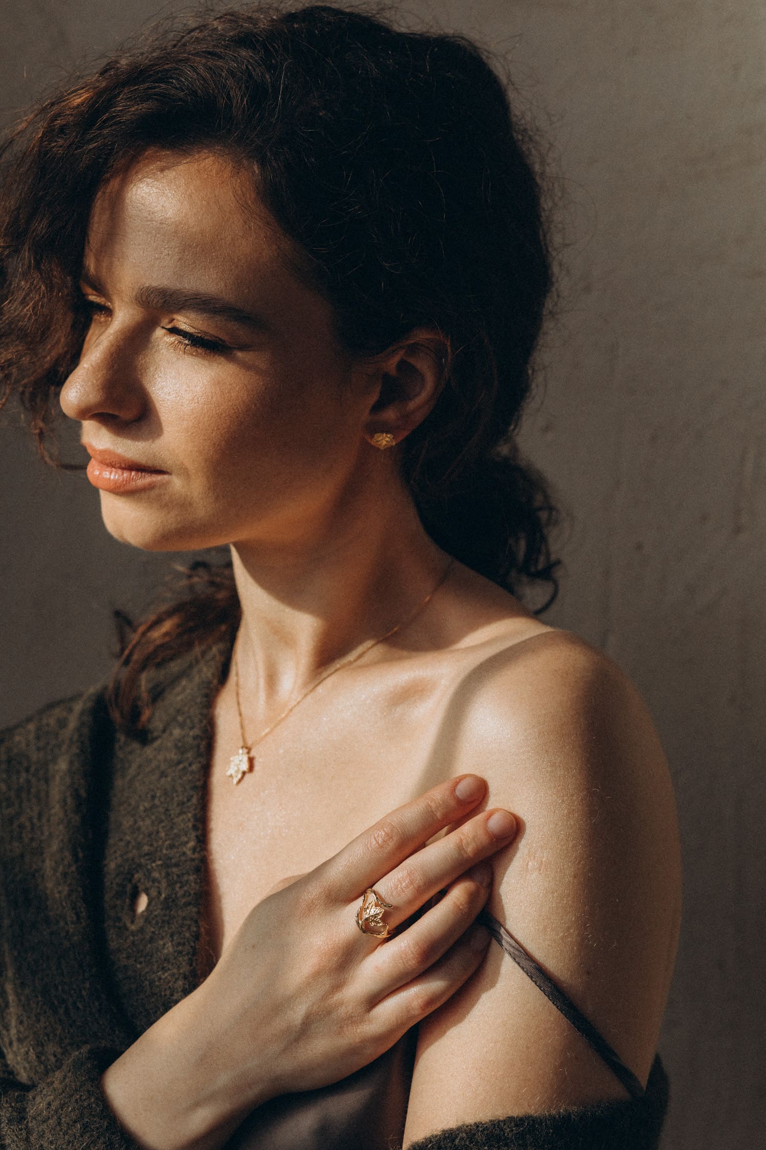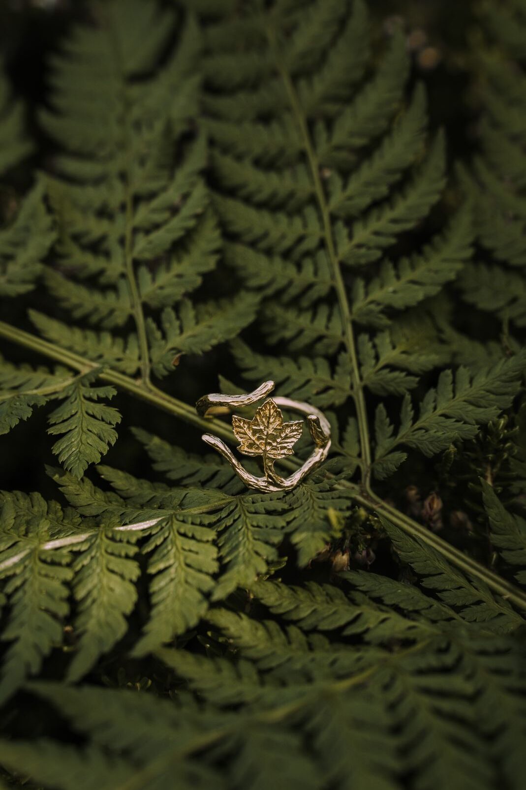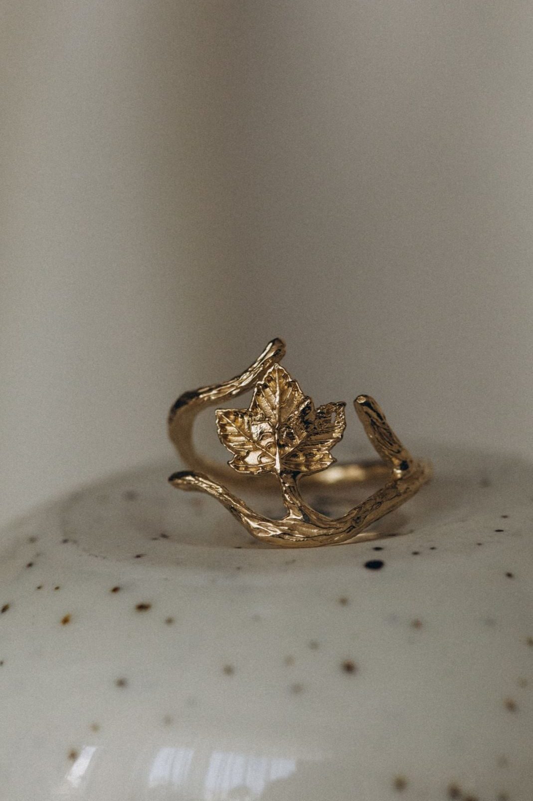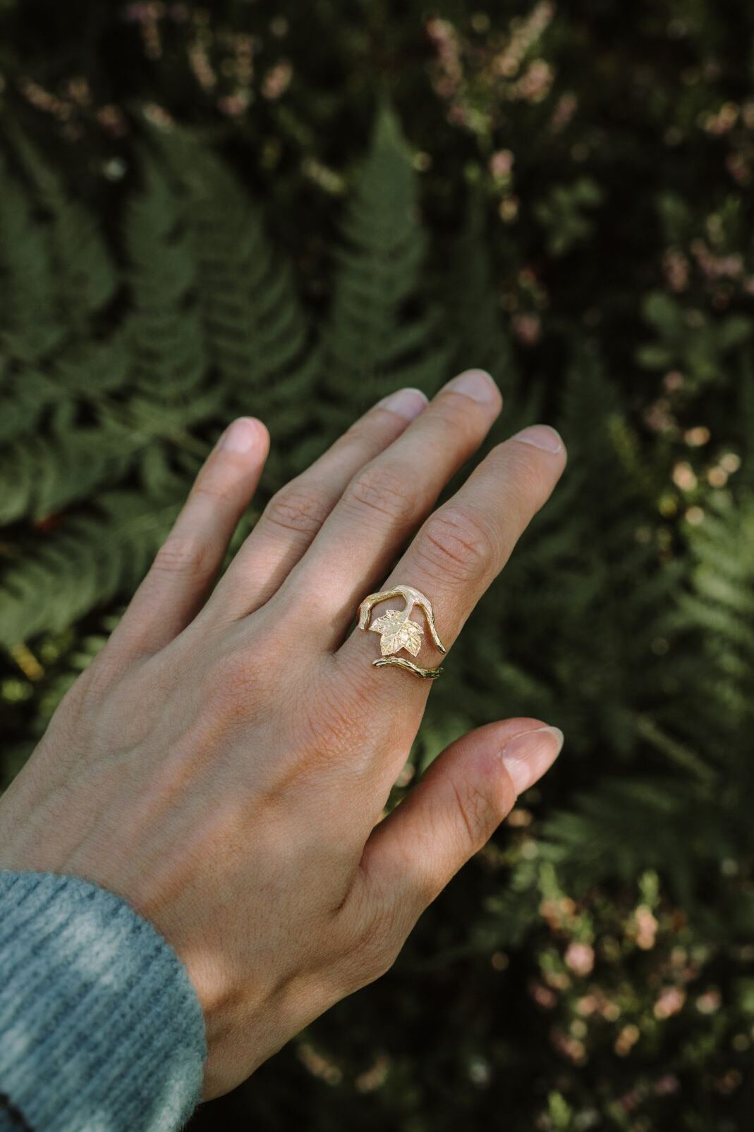 Einzigartiger Ring mit einem Bergahornzweig, aus 925er Silber, vergoldet mit 18-karätigem Gold. Ideal für Naturliebhaberinnen.