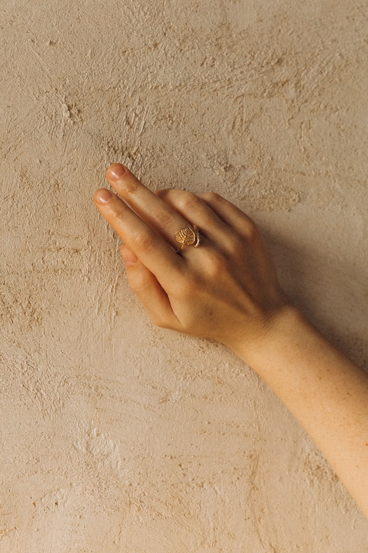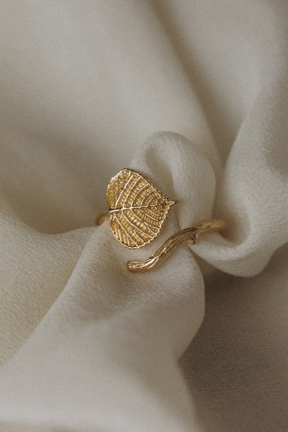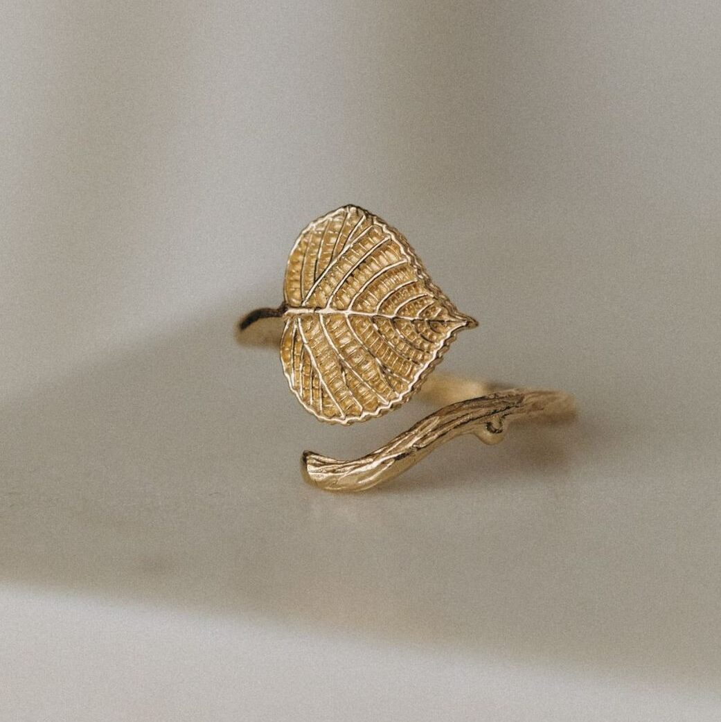 Waldring mit Lindenast, aus 925er Silber, vergoldet mit 18-karätigem Gold. Perfekt für Naturliebhaberinnen.