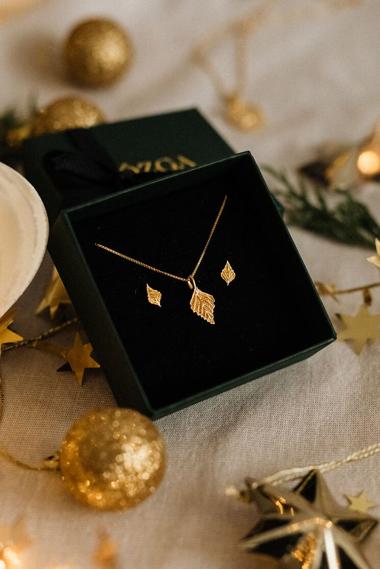 Vergoldetes Set BIRKENBLÄTTER – Ohrstecker und Halskette