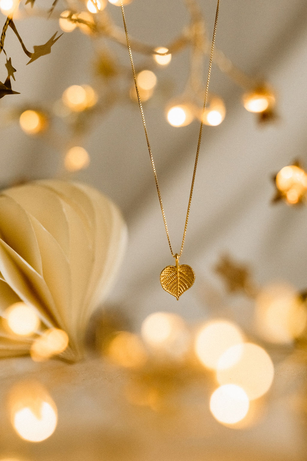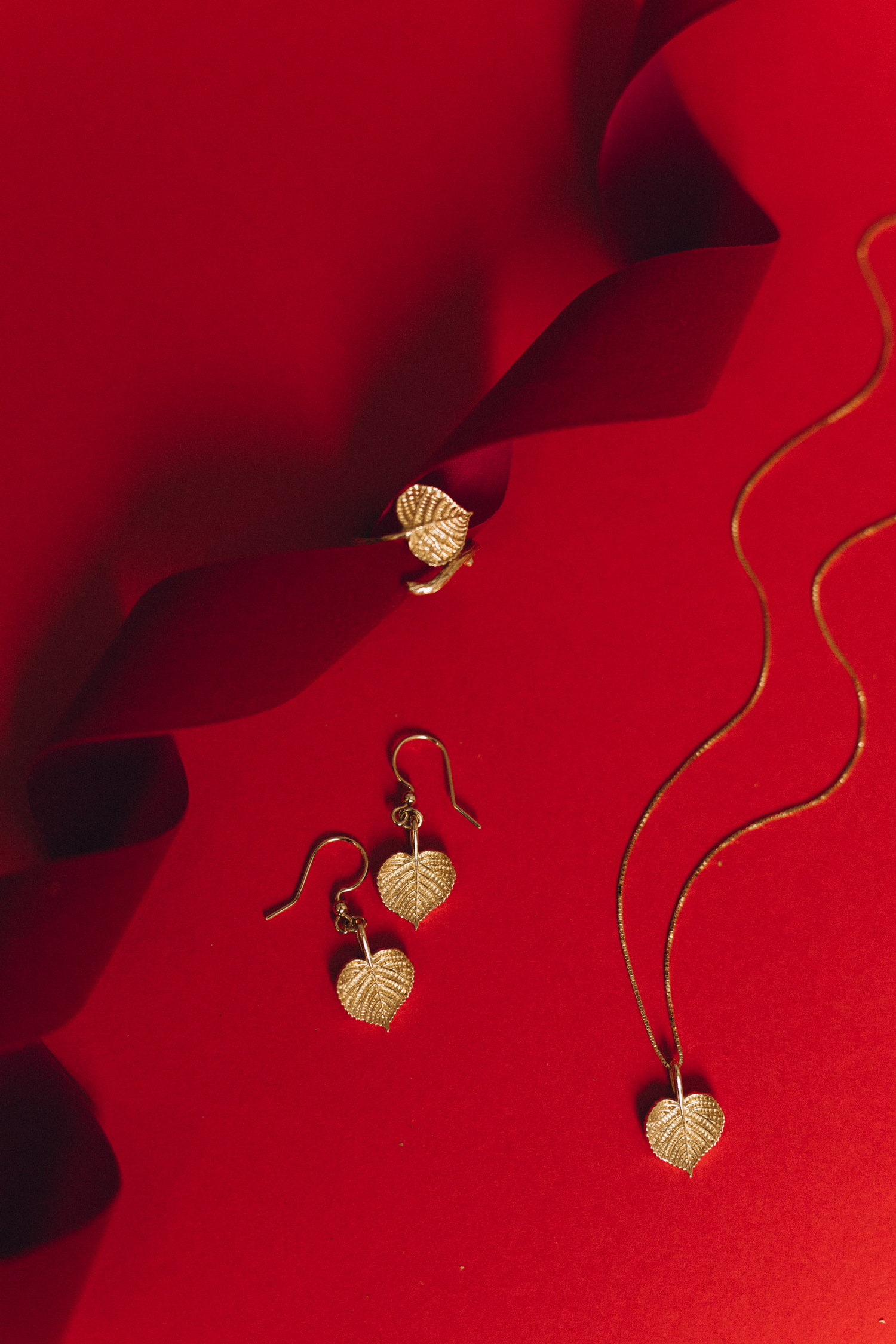 Zartes, sinnliches Set mit Lindenblättern aus vergoldetem Silber. Es erinnert daran, dass Liebe und Sensibilität eine kraftvolle Stärke sind.
