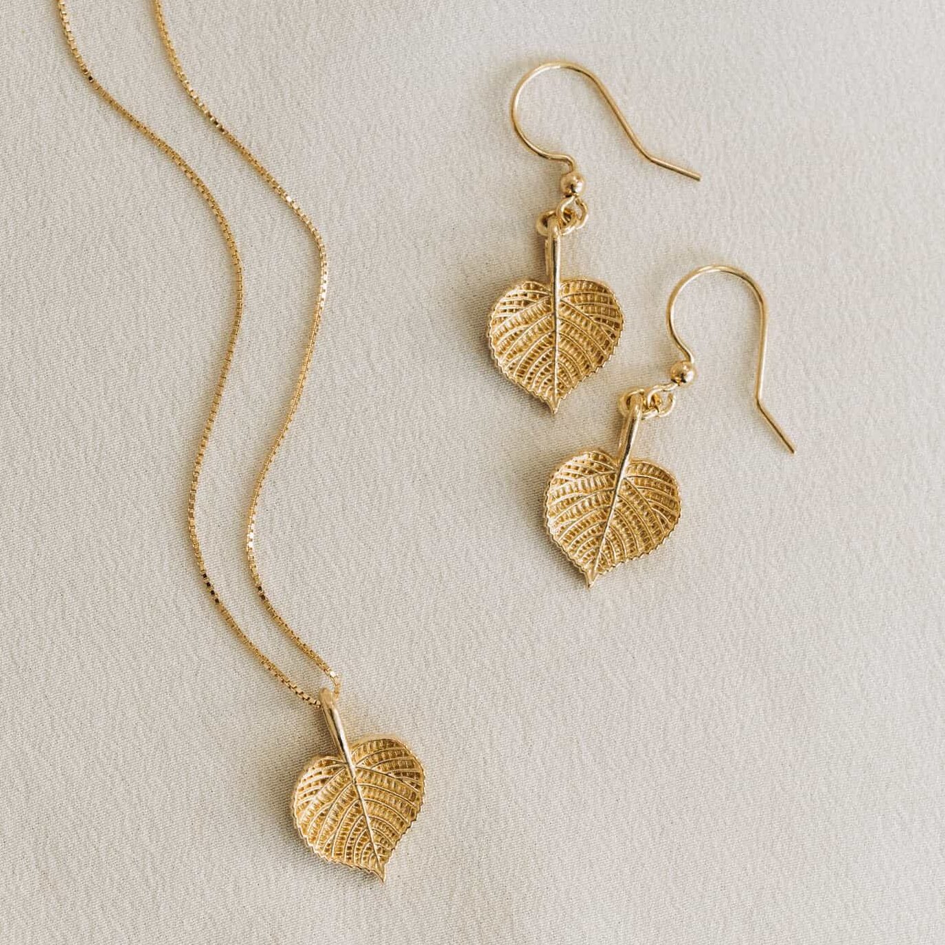 Vergoldetes Set LINDENBLATT – hängende Ohrringe und Halskette